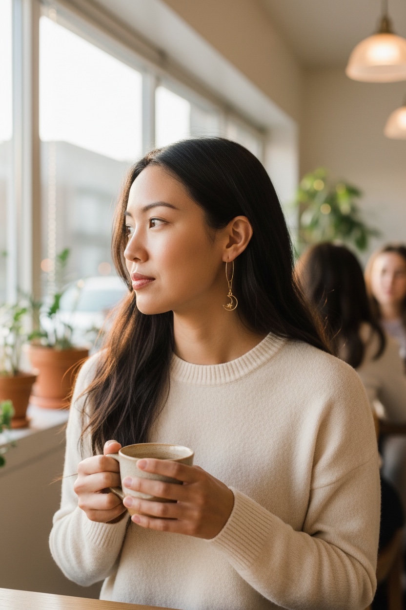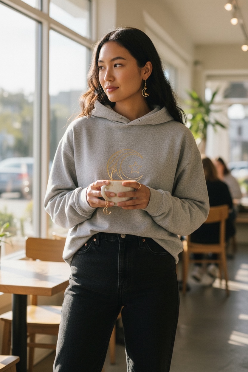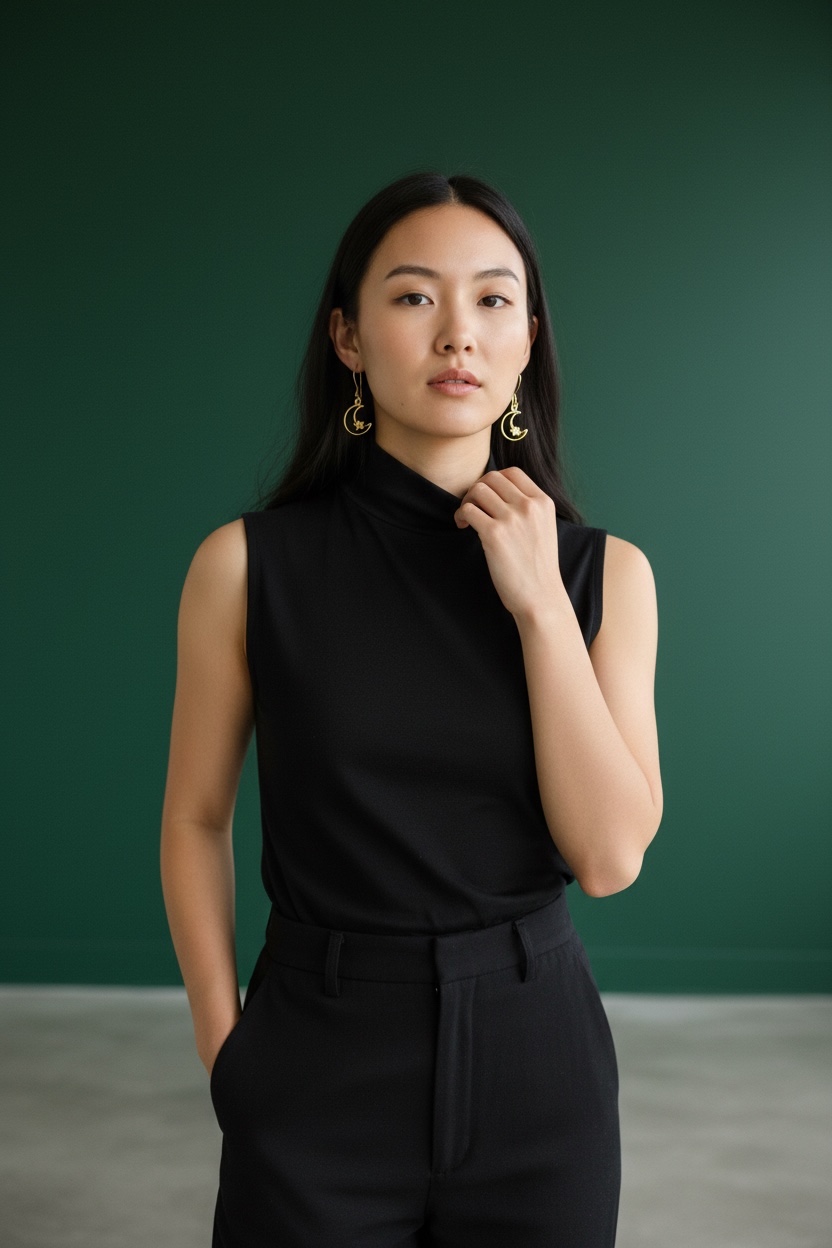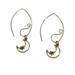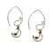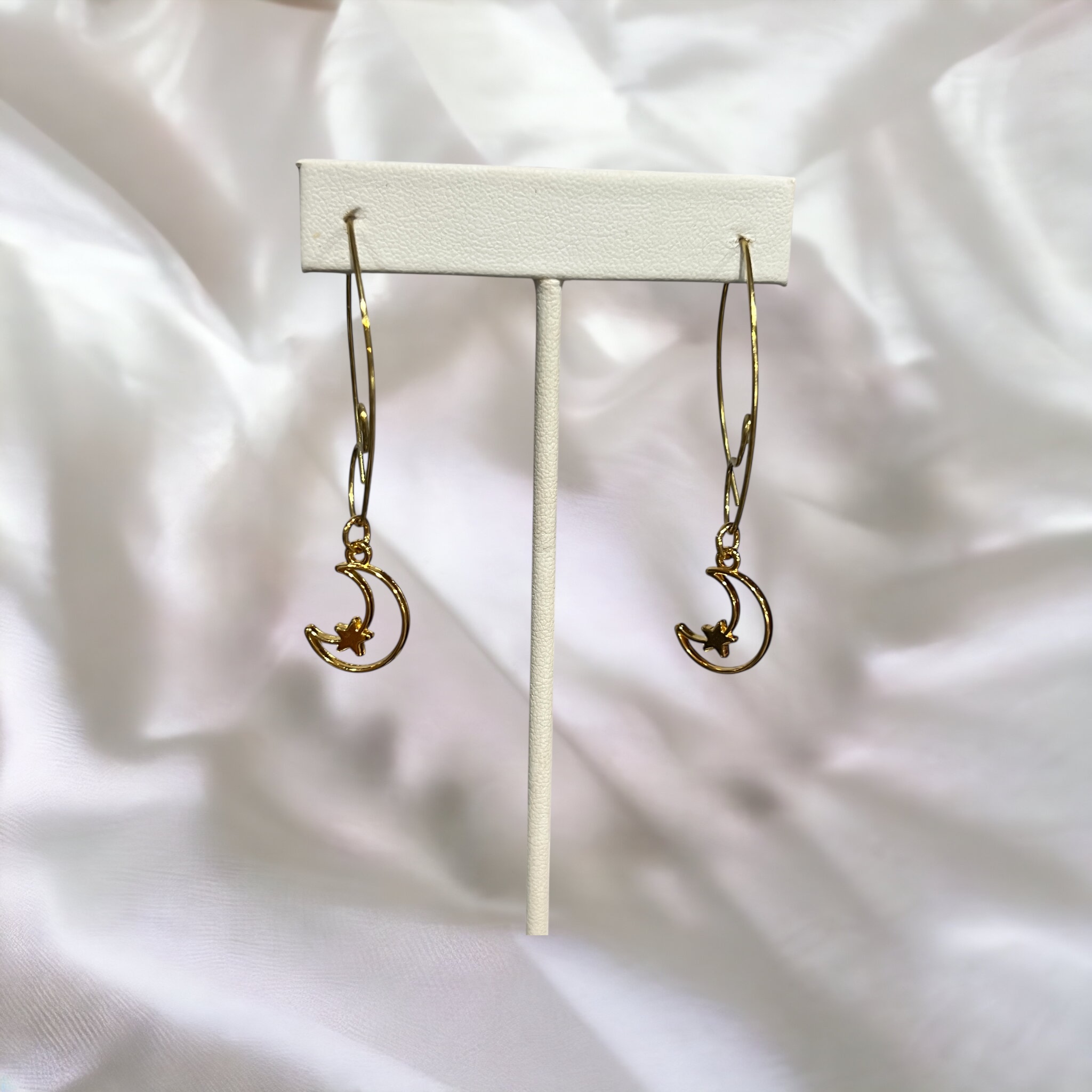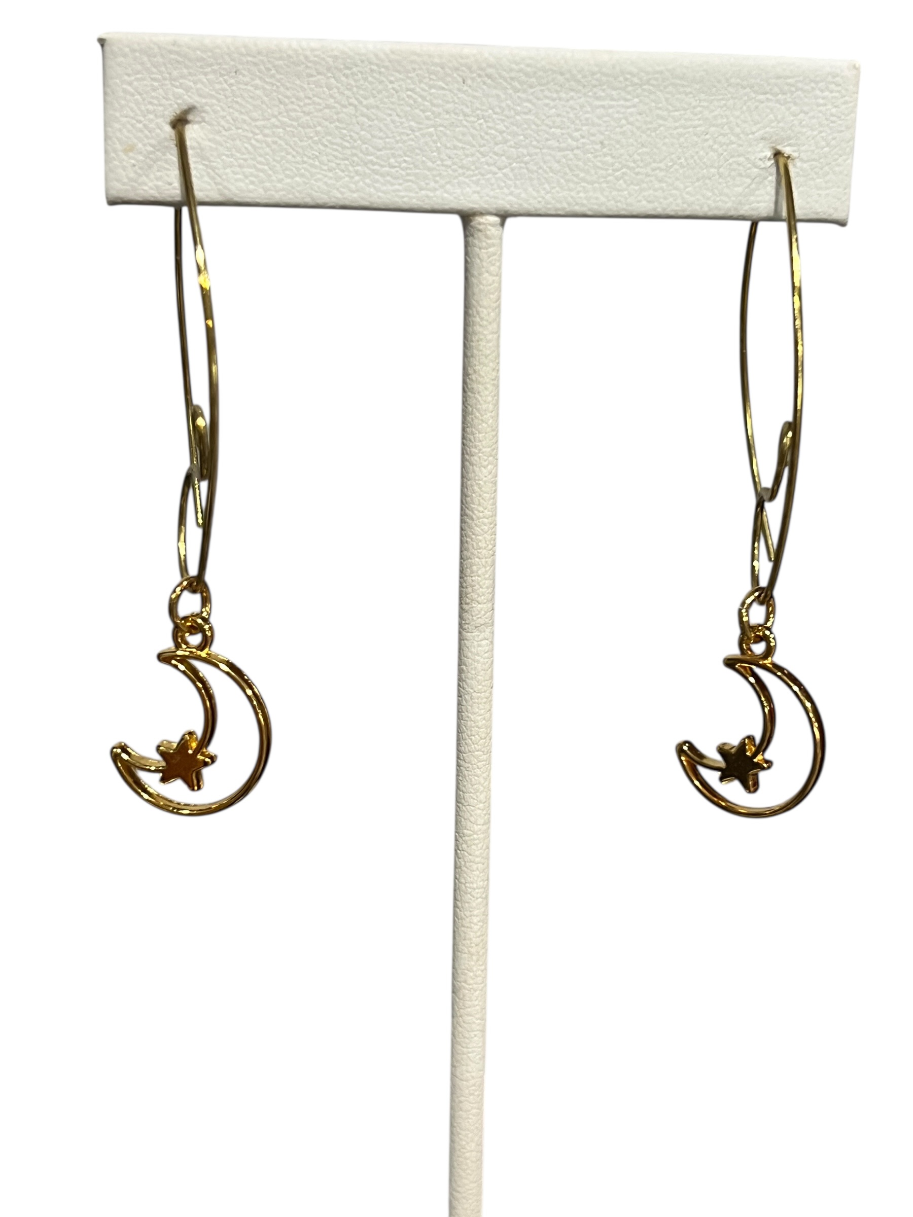 Dangle earrings with 18k gold plated stainless steel half moon and star and a unique long hook ear wire. Length when wearing is 2" long. Flattering and fun to wear. Lightweight.