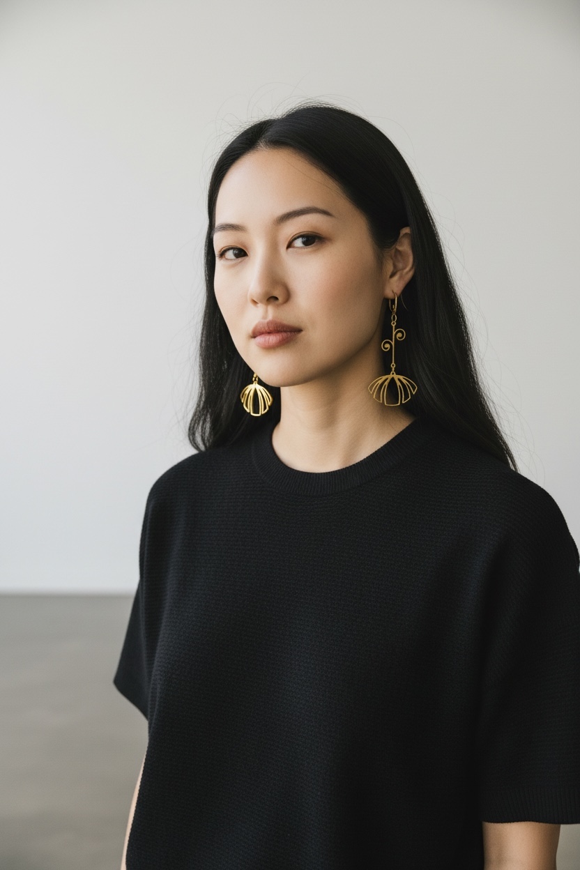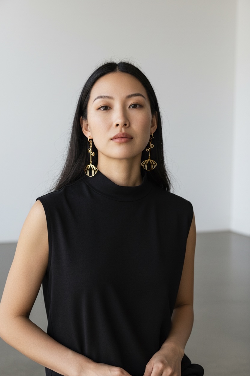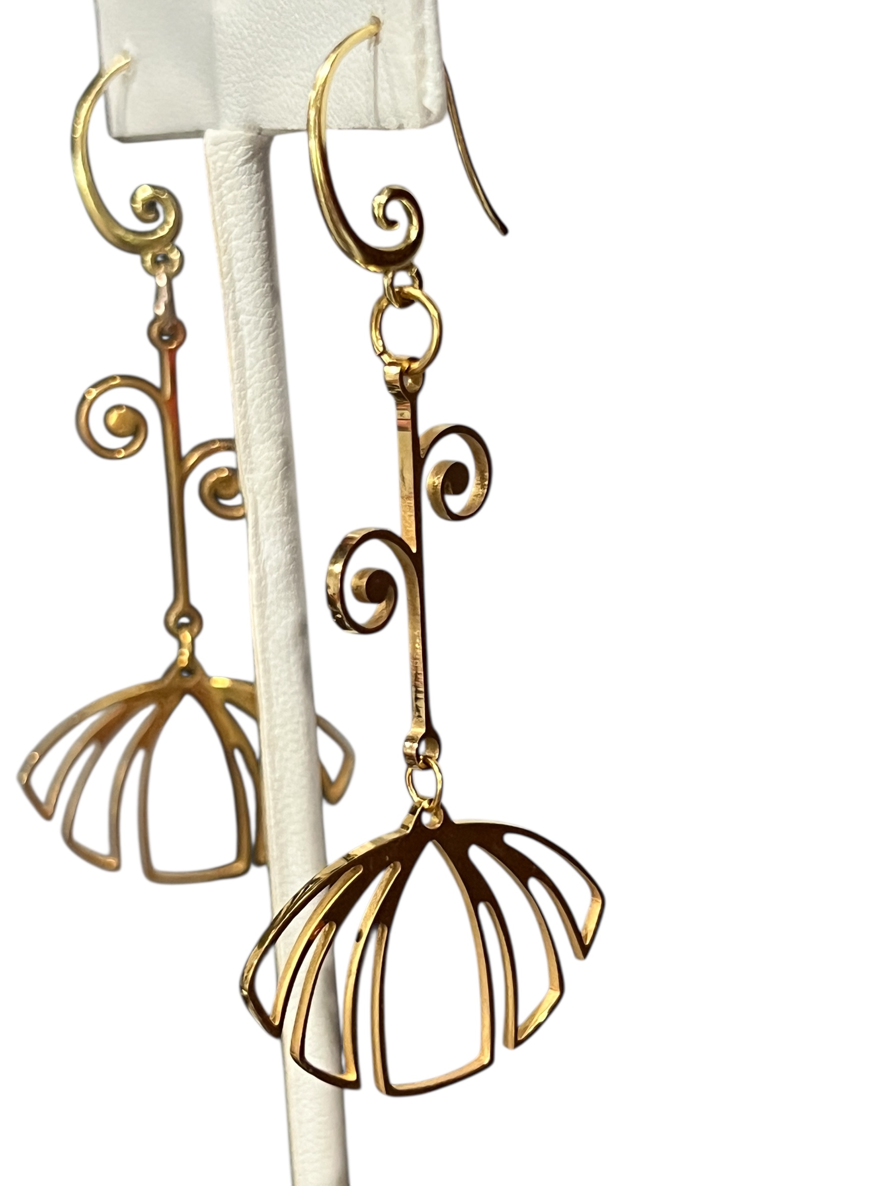 Dangle earrings with 18k gold plated stainless 20x29mm flower and 15x28mm stem with swirled leaves and a unique swirled hook brass ear wire. Length when wearing is 2" long. Flattering and fun to wear. Lightweight.