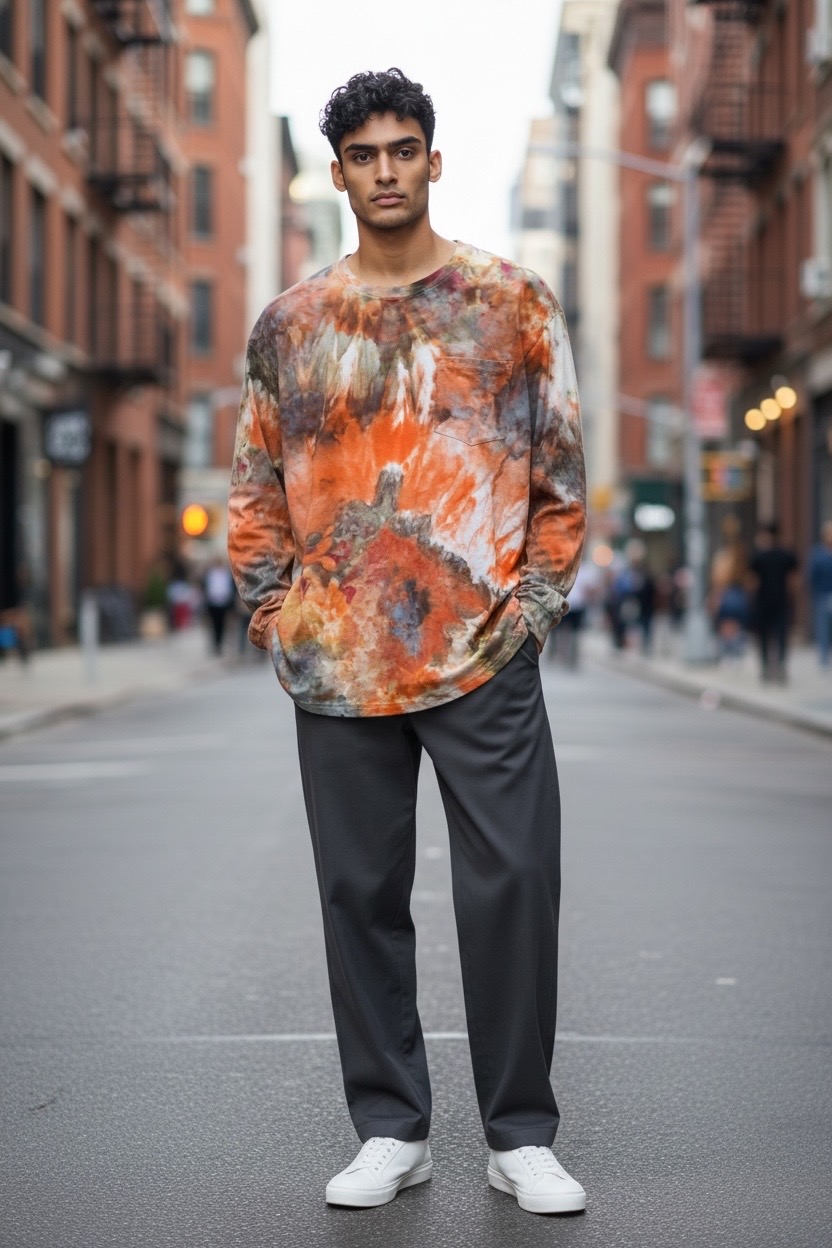 Enjoy the comfort of an ice-dyed long-sleeved shirt in multiple colors of orange, mist grey, amber, bronze and more. The ice dyeing process causes the dyes to separate, so many unplanned colors emerge to create one-of-a-kind patterns.