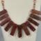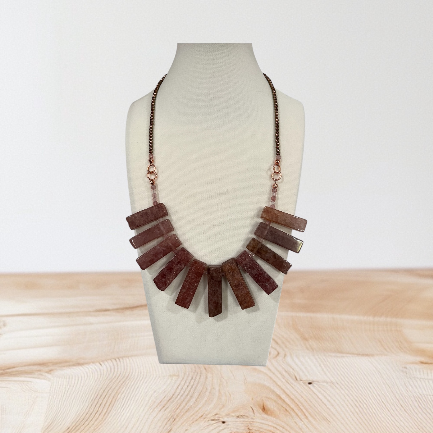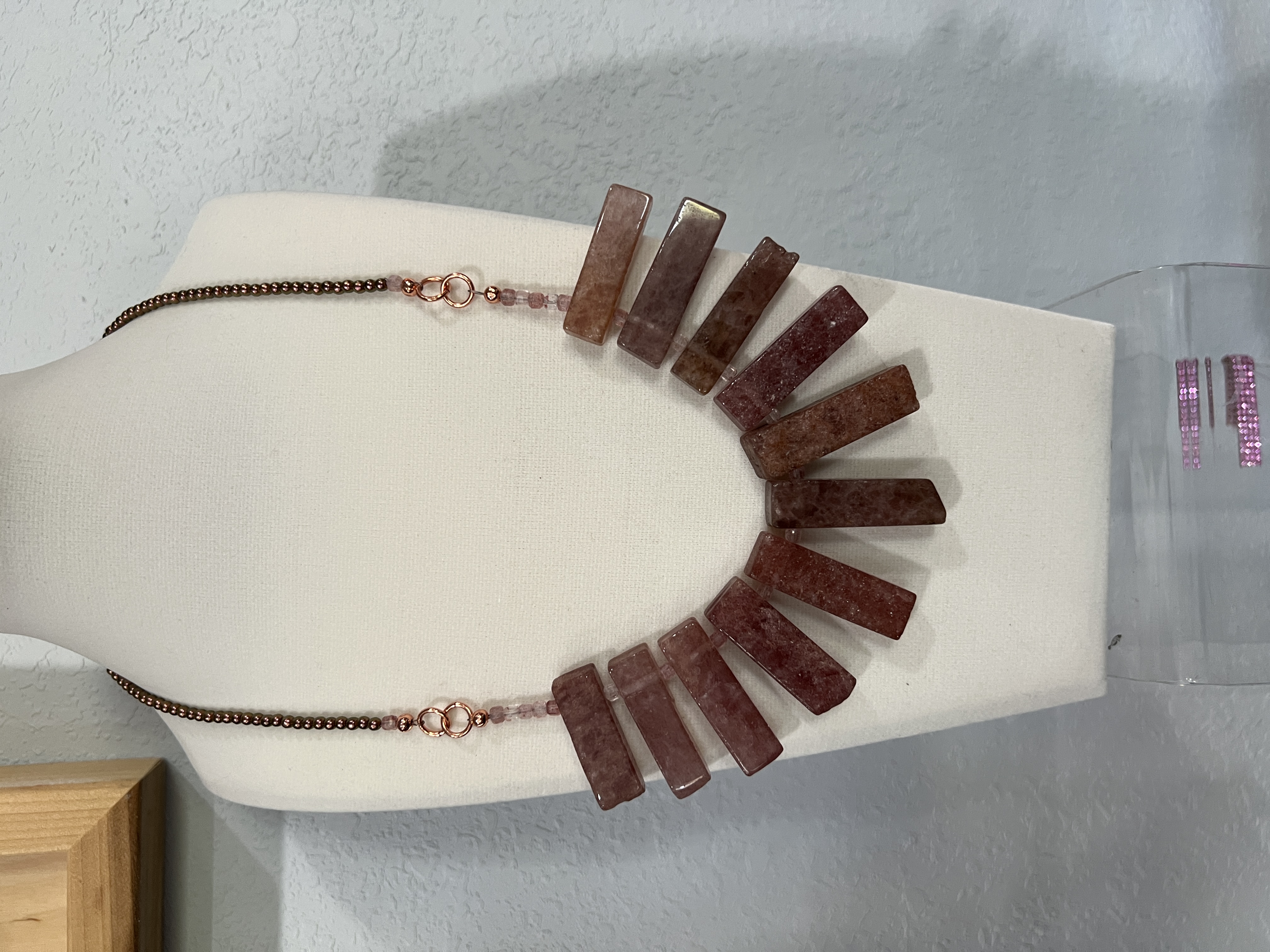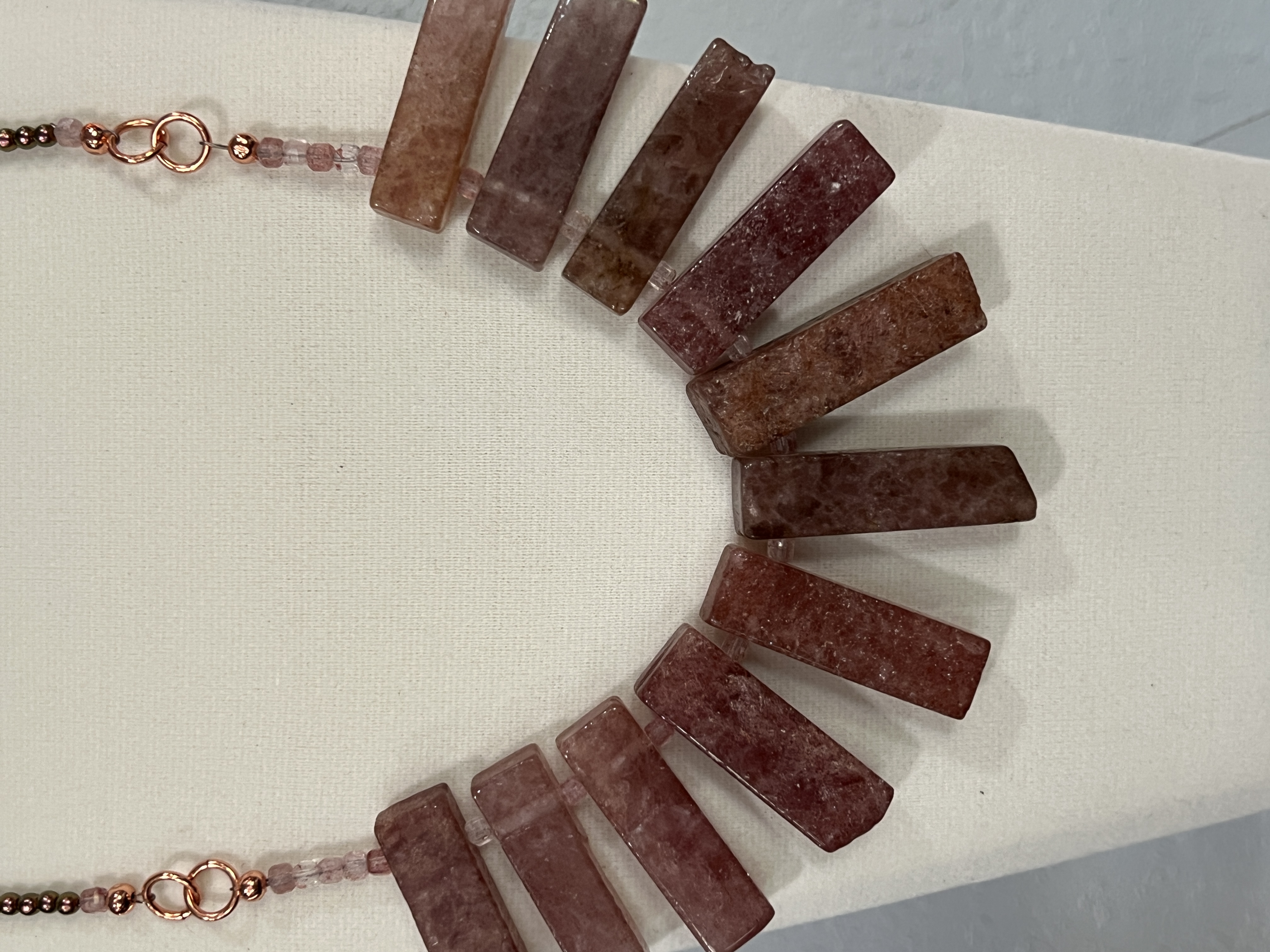Elegant statement piece--fanning strawberry quartz and small Czech beads--make the holidays bright. Strawberry quartz is a rare soft pinkish-red hue and will complement any other color worn.